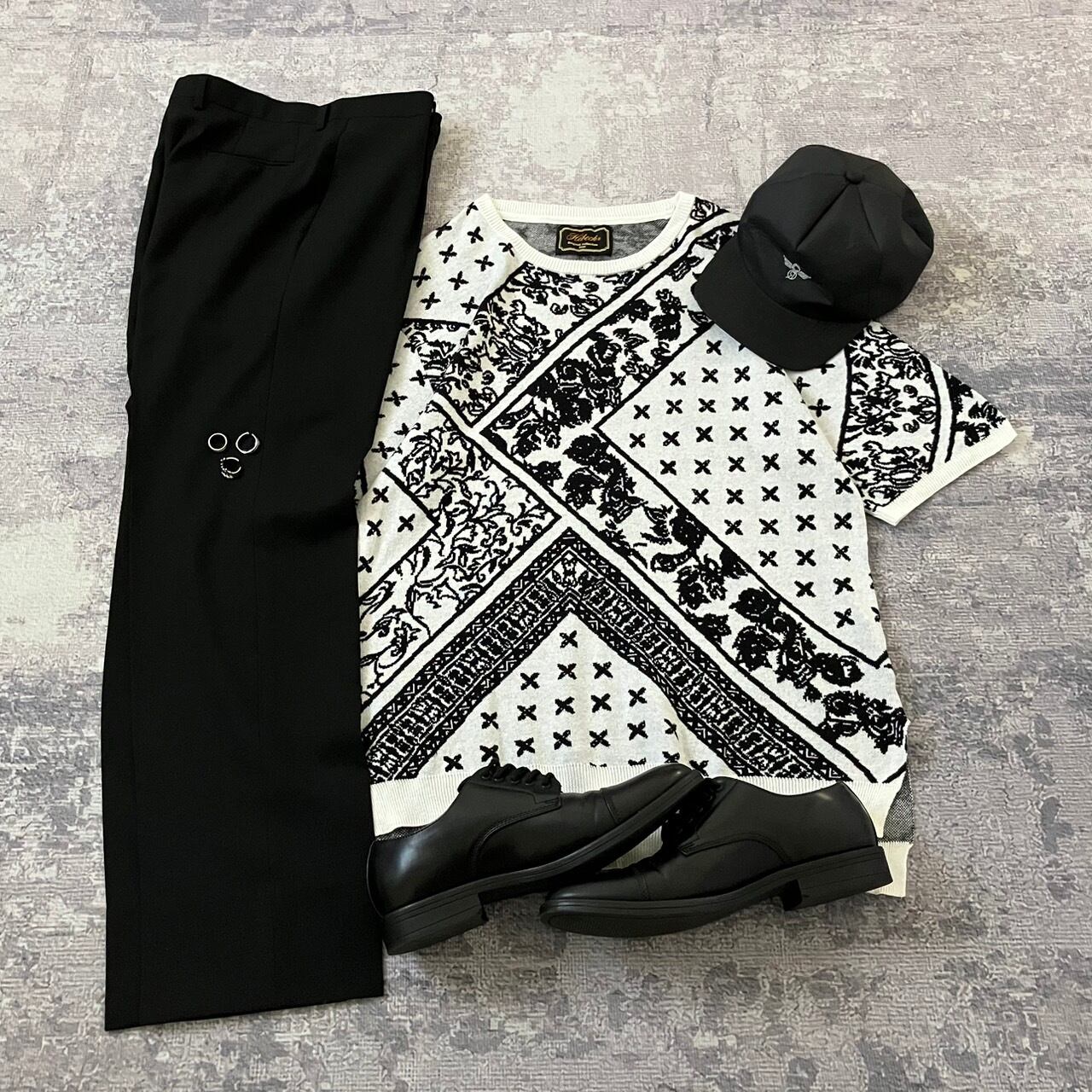 ニットTシャツ、パンツ、リング×3