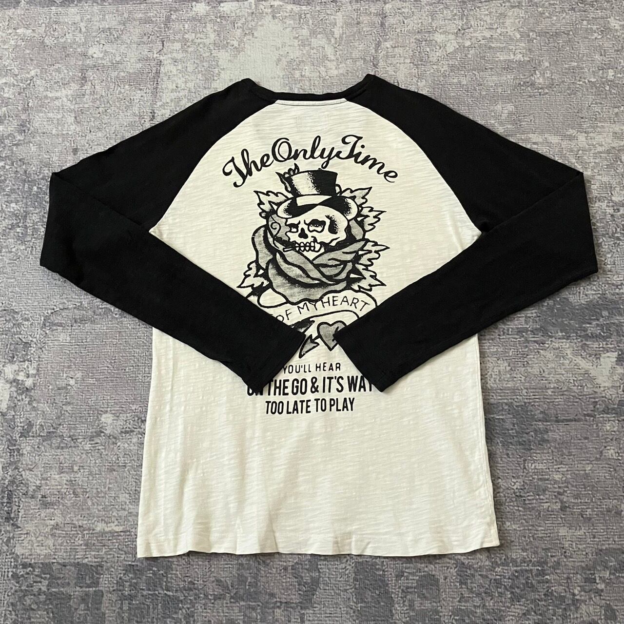 ヴィンテージのスカルロゴのラグランTシャツ、