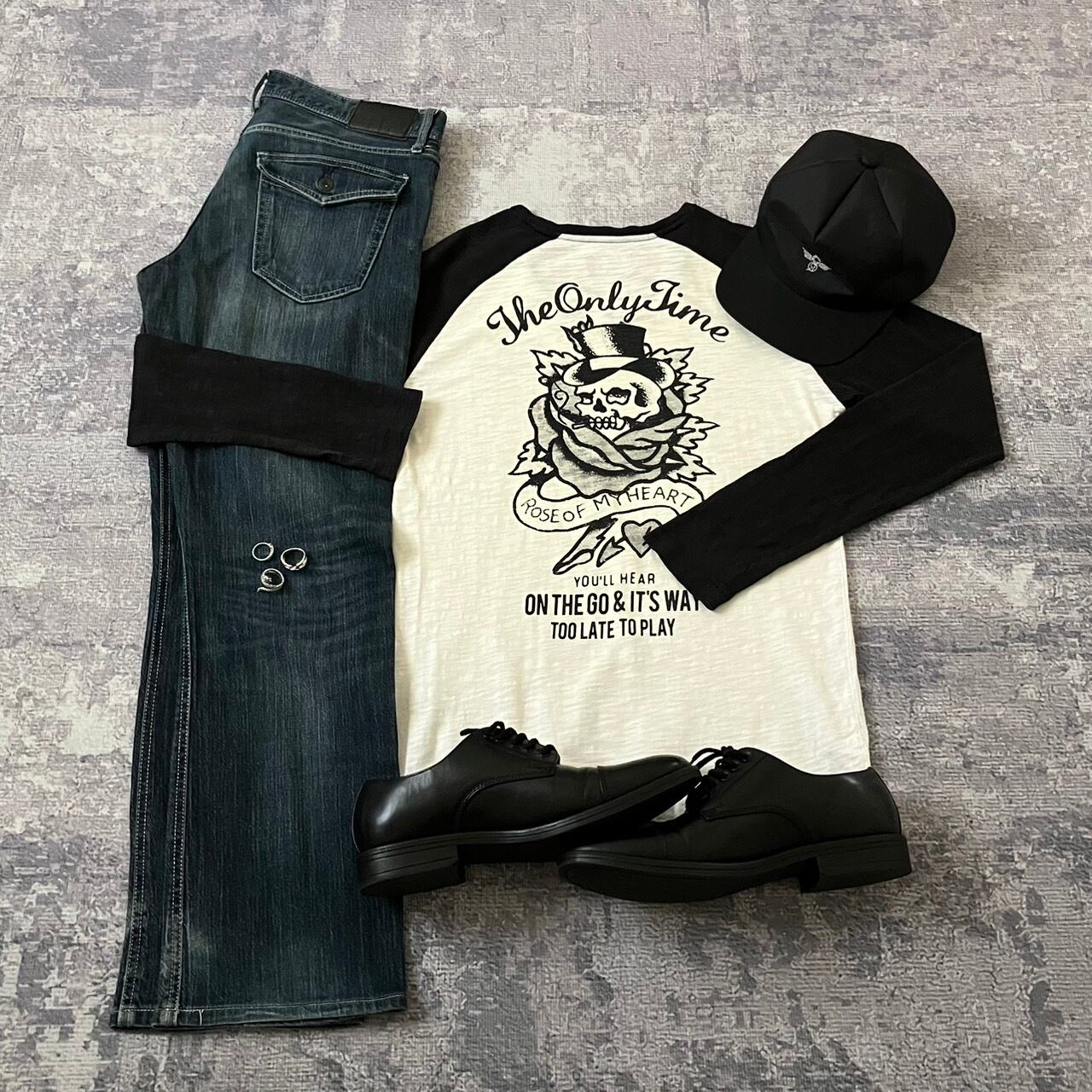 カットソー、パンツ、リング×3